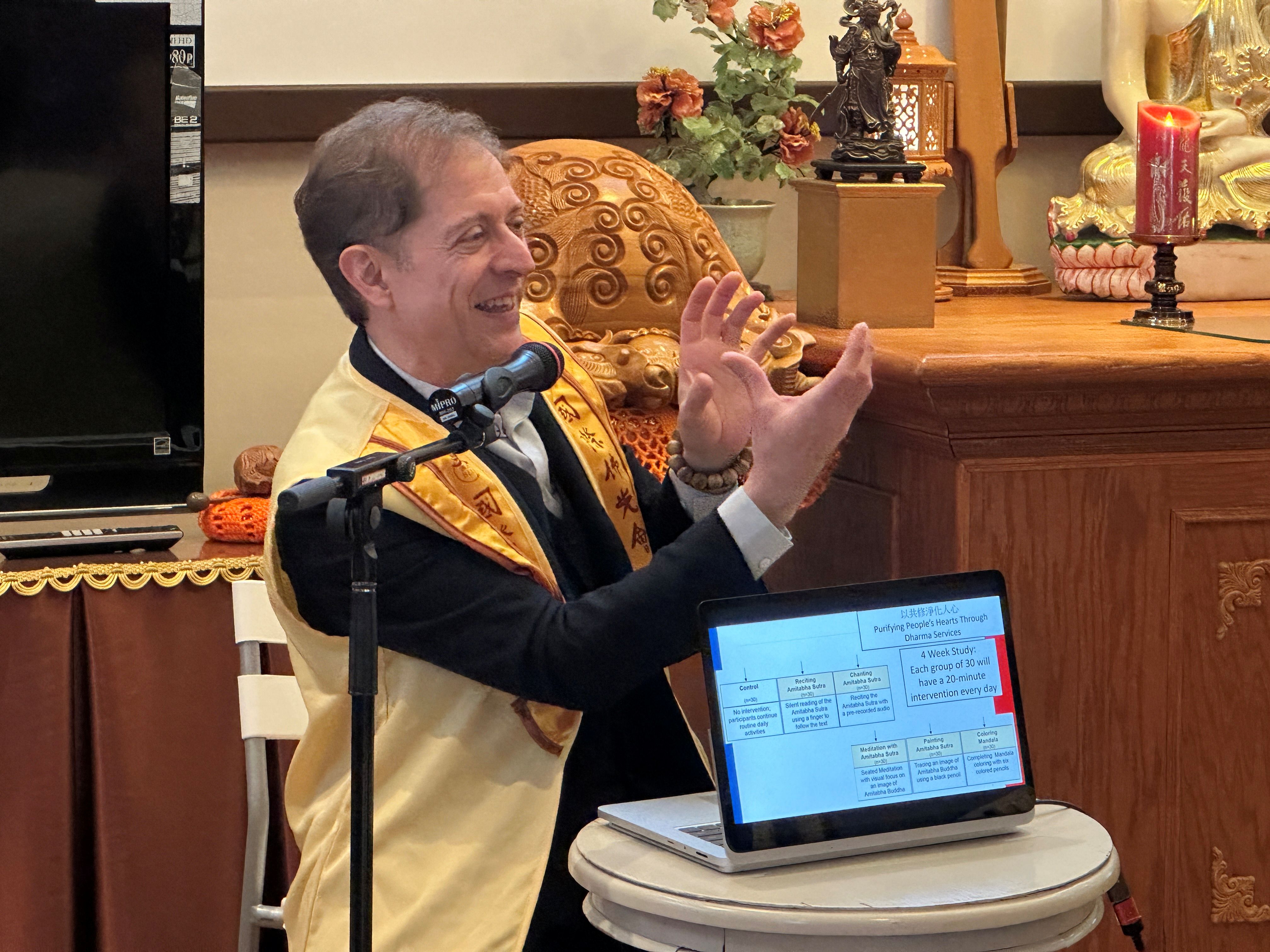 Speaking in fluent Mandarin, Dr. Hollowayoutlined scientific methodologies used to study Buddhist collective practices, including meditation, the contemplation of Buddha images, and the physiological impact of Buddhist arts such as calligraphy, music, and painting. Research findings presented during the lecture indicated that participation in group Dharma activities can help focus scattered thoughts, stabilize emotions, and promote relaxation of both body and mind. Additional outcomes suggested enhanced mind–body coherence, deeper spiritual resonance, and positive effects on family harmony and social well-being.