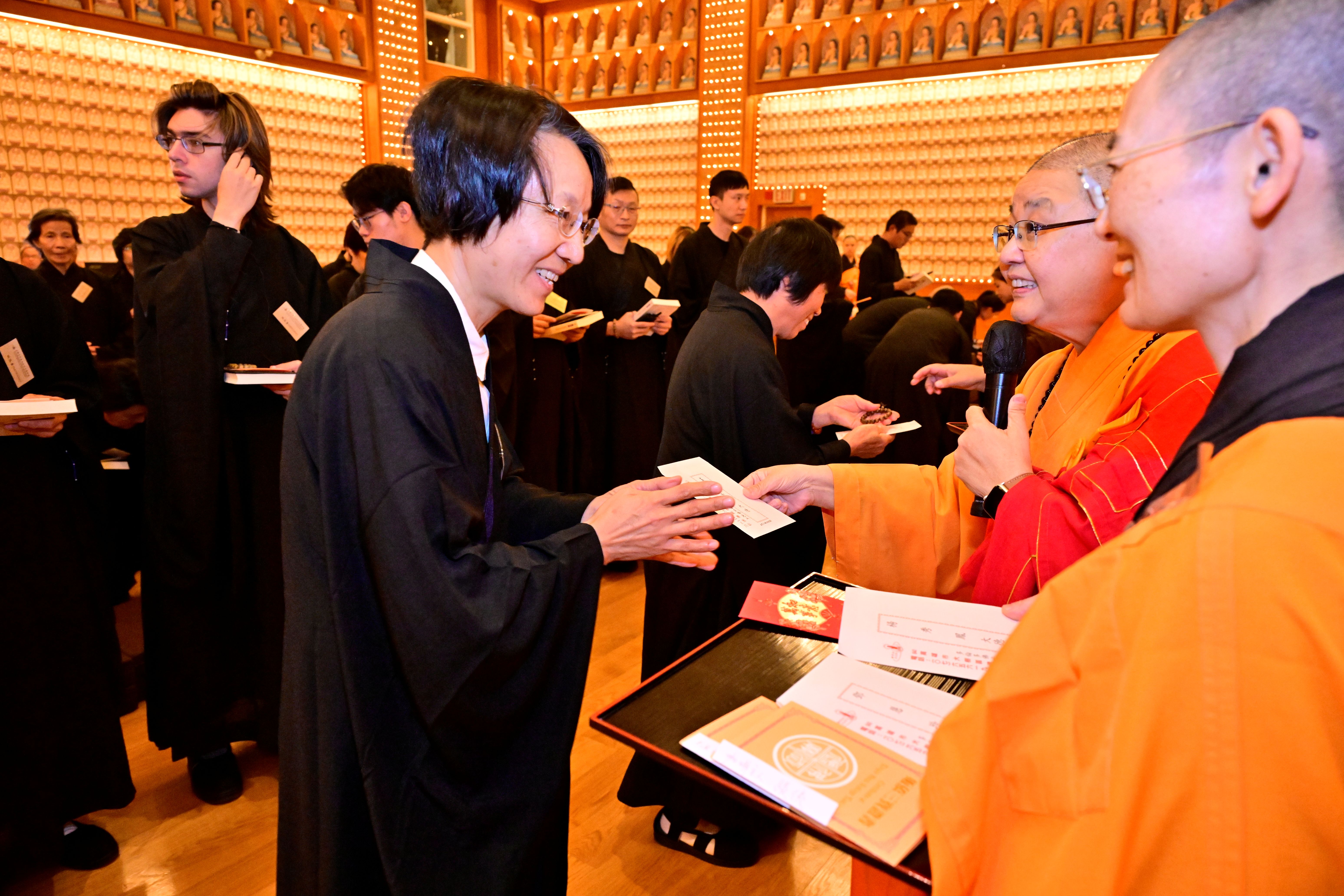 Venerable Chueh Fan further explained that the temple is like a refueling station and a marketplace where everyone can recharge and choose their own path of cultivation—whether by joining activities, attending courses, or serving as volunteers. After the ceremony, refuge certificates, commemorative gifts, and a copy of The Biography of Sakyamuni Buddha were presented to the new disciples as blessings and encouragement for their continued practice.